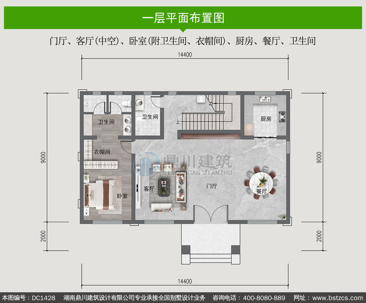 | 一 层: | 门厅、客厅(中空)、卧室(附卫生间、衣帽间)、厨房、餐厅、卫生间 | |||