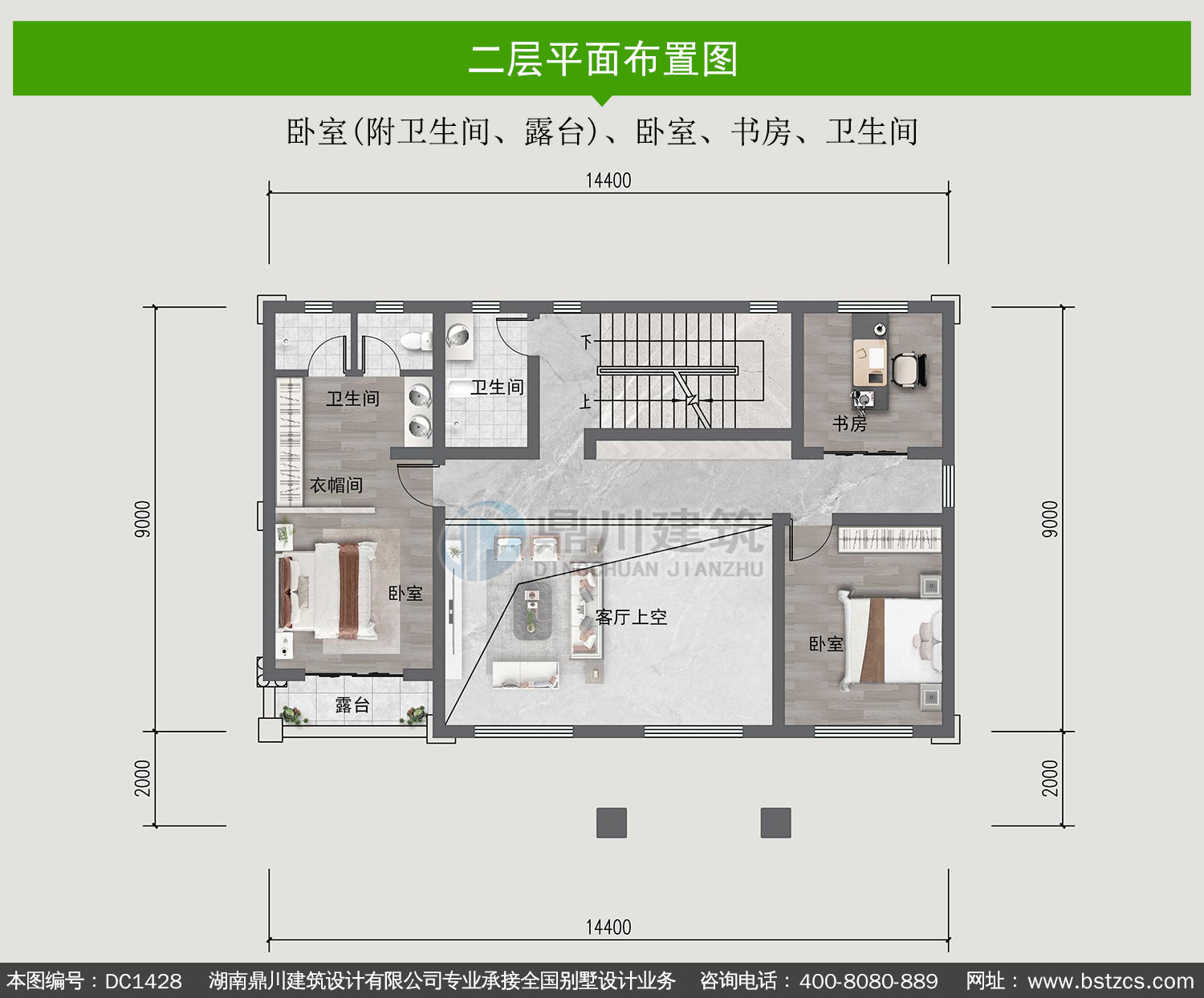| 二 层: | 卧室(附卫生间、露台)、卧室、书房、卫生间 | |||
