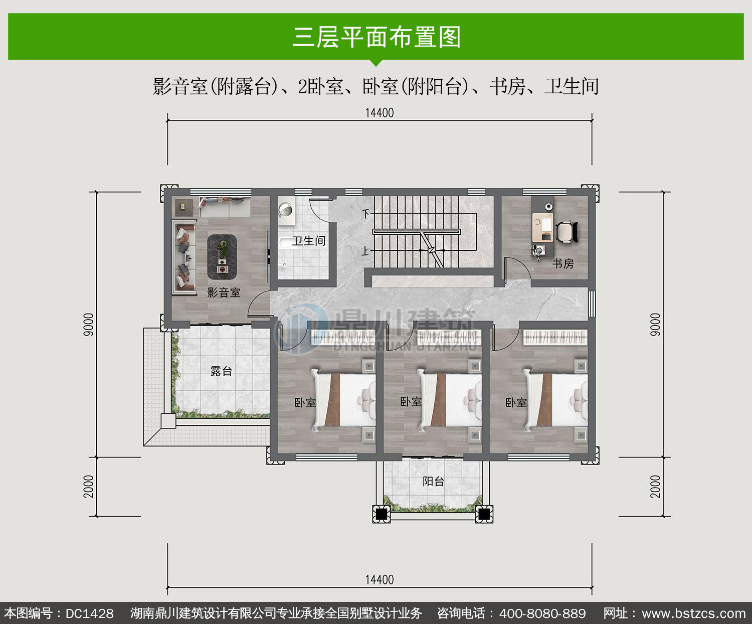 | 三 层: | 影音室(附露台)、2卧室、卧室(附阳台)、书房、卫生间 | |||