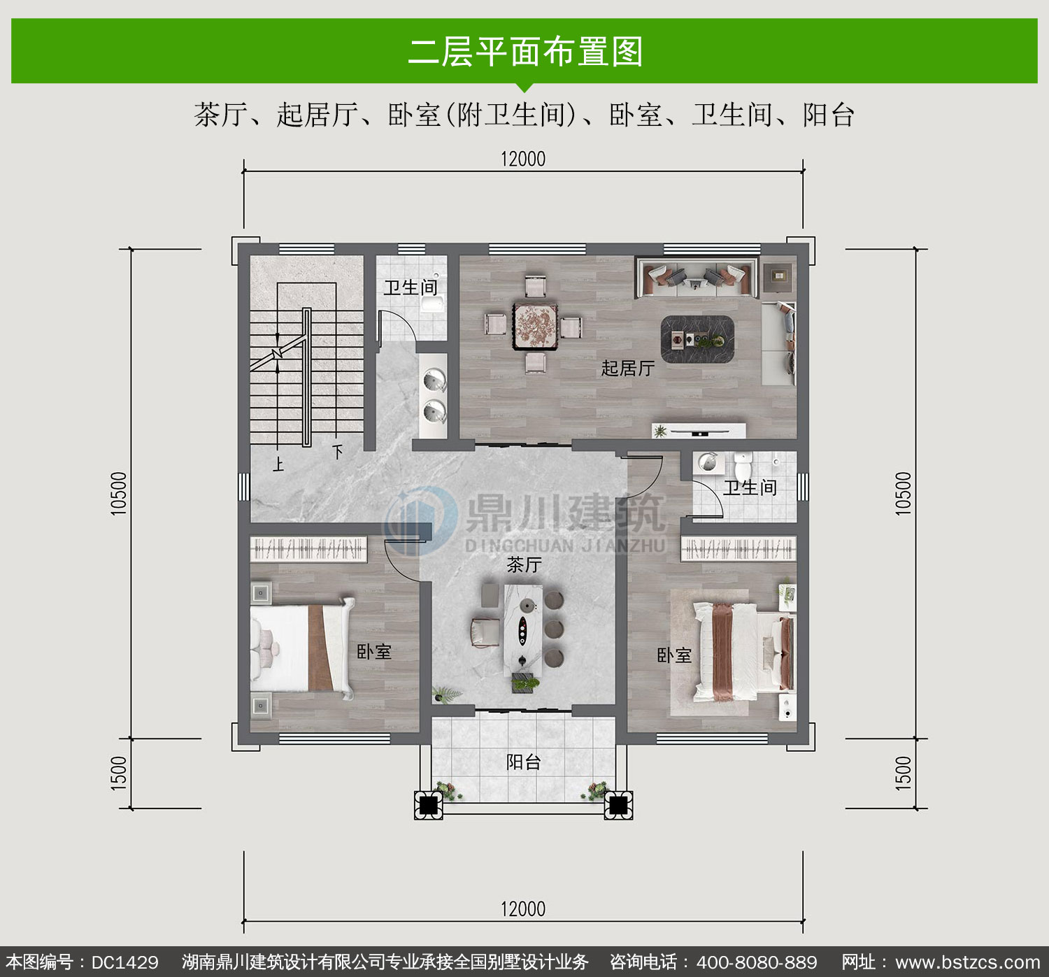 | 二 层: | 茶厅、起居厅、卧室(附卫生间)、卧室、卫生间、阳台 | |||