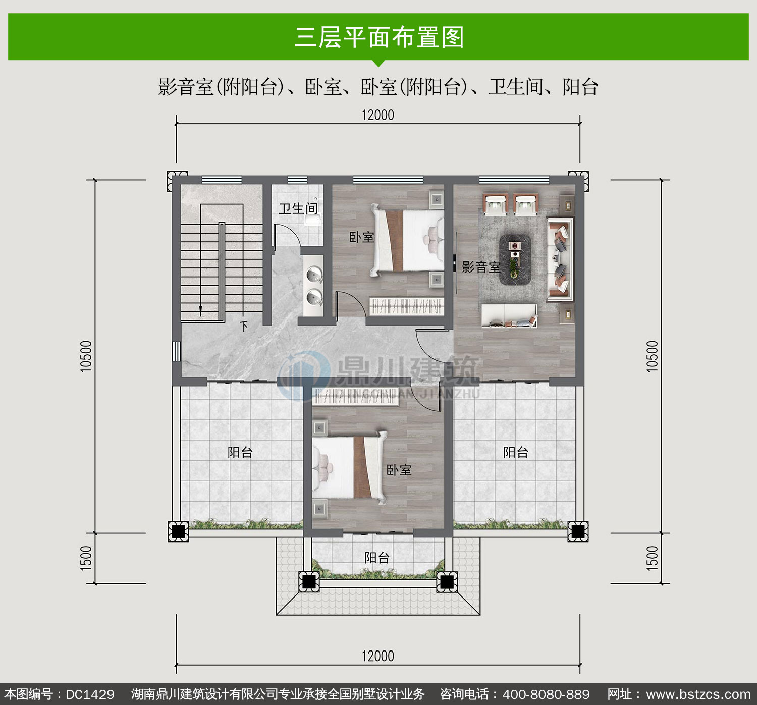 | 三 层: | 影音室(附阳台)、卧室、卧室(附阳台)、卫生间、阳台 | |||