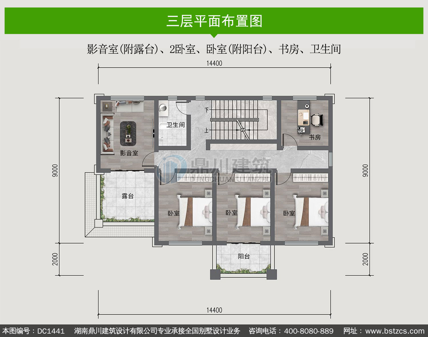| 三 层: | 影音室(附露台)、2卧室、卧室(附阳台)、书房、卫生间 | |||