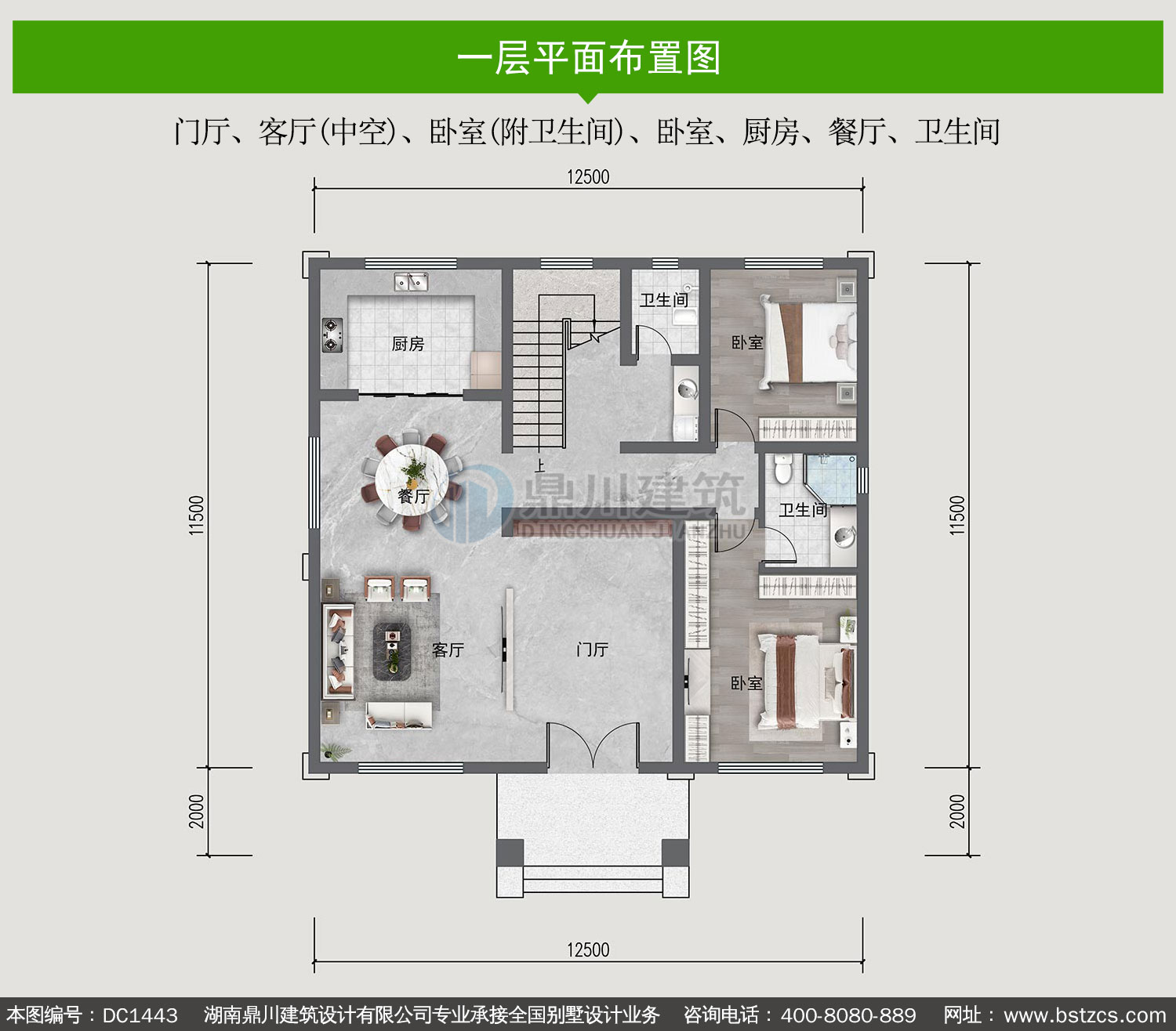 | 一 层: | 门厅、客厅(中空)、卧室(附卫生间)、卧室、厨房、餐厅、卫生间 | |||