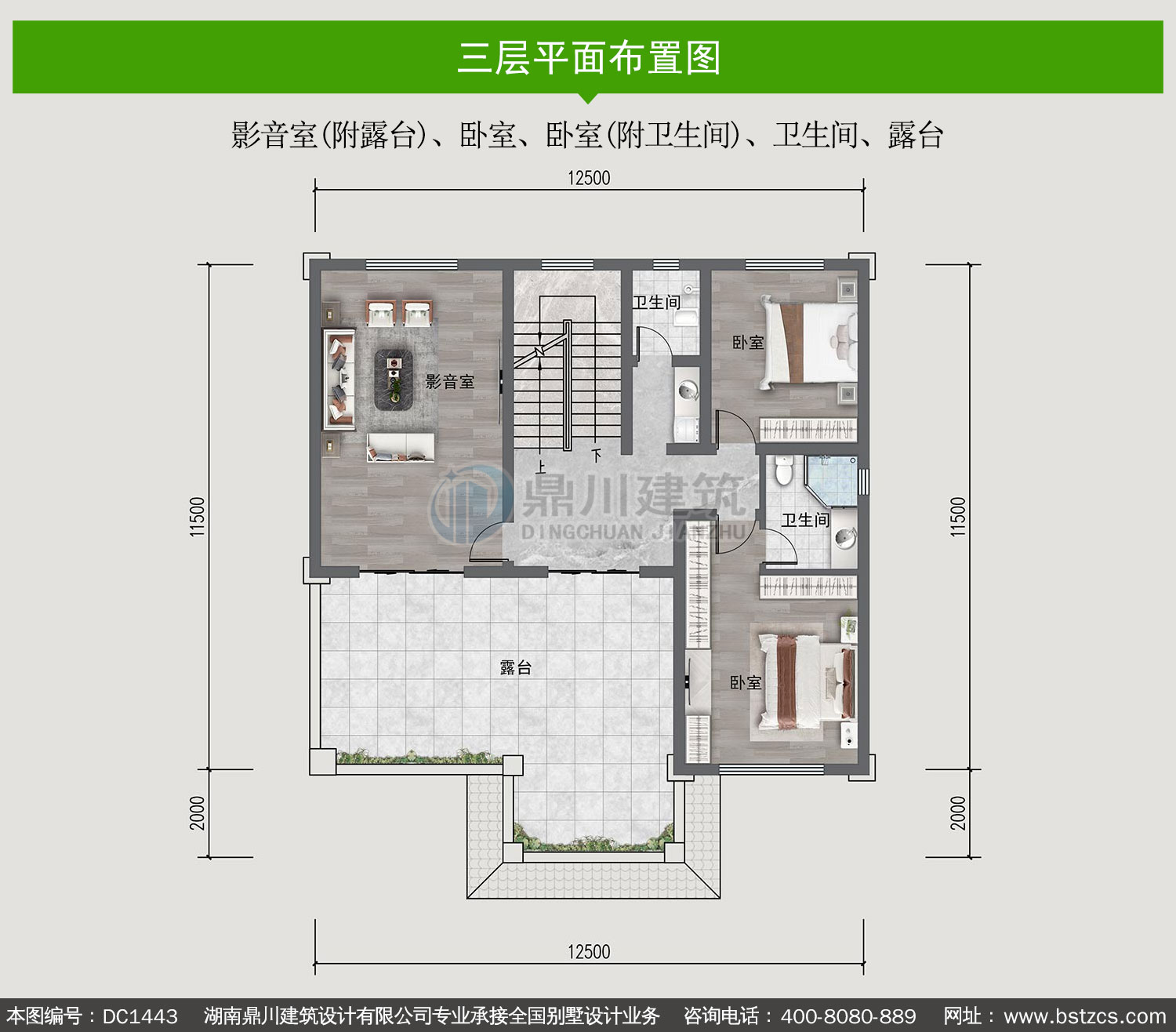 | 三 层: | 影音室(附露台)、卧室、卧室(附卫生间)、卫生间、露台 | |||