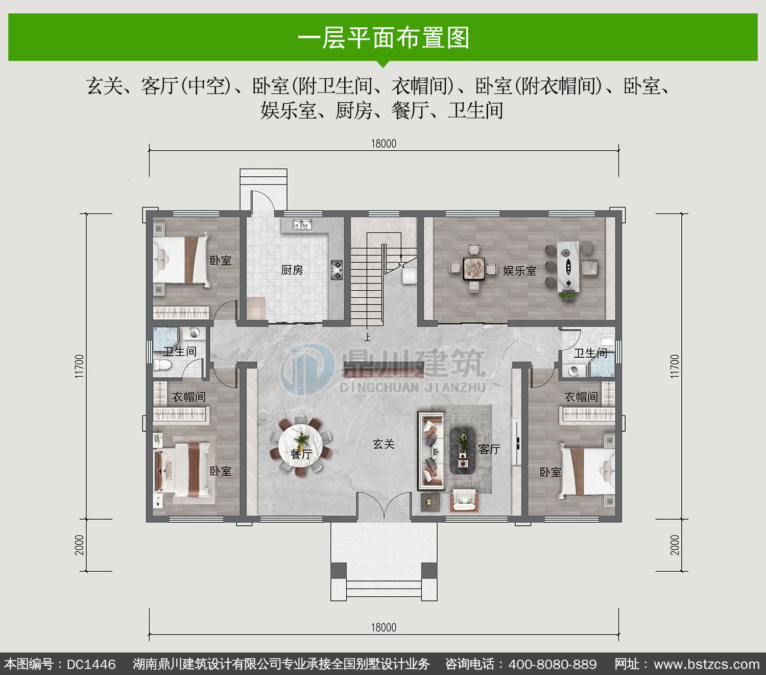 | 一 层: | 玄关、客厅(中空)、卧室(附卫生间、衣帽间)、卧室(附衣帽间)、卧室、娱乐室、厨房、餐厅、卫生间 | |||