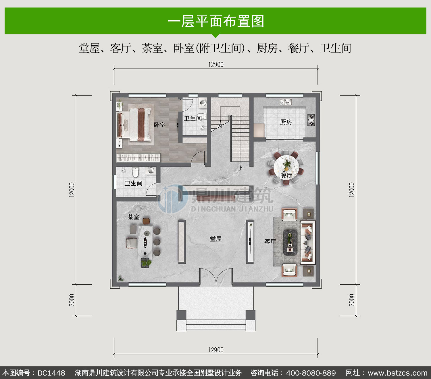 | 一 层: | 堂屋、客厅、茶室、卧室(附卫生间)、厨房、餐厅、卫生间 | |||