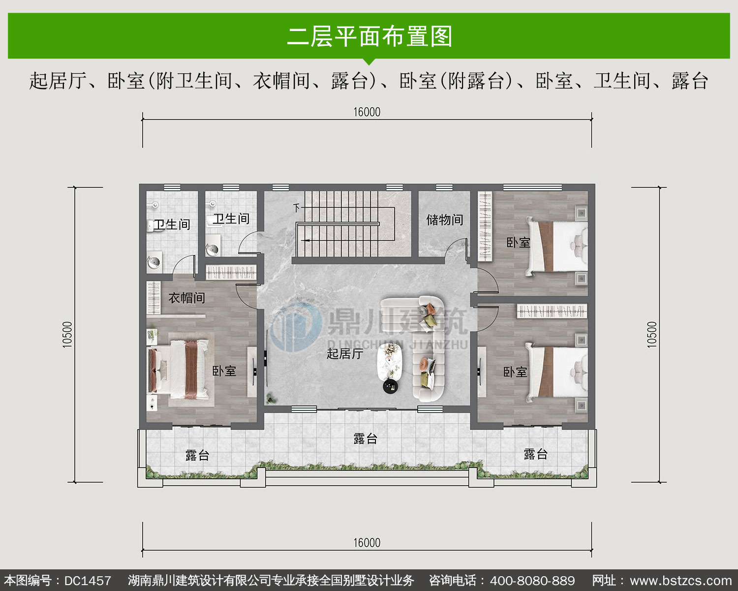 | 二 层: | 起居厅、卧室(附卫生间、衣帽间、露台)、卧室(附露台)、卧室、卫生间、露台 | |||