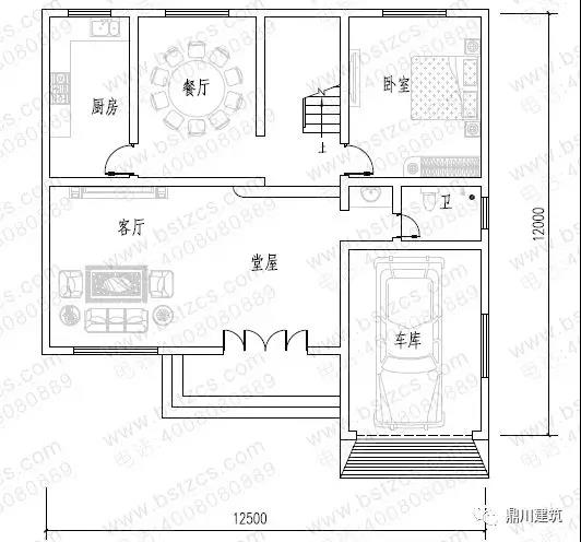 一层:客厅、卧室、厨房、餐厅、储藏室、卫生间、车库