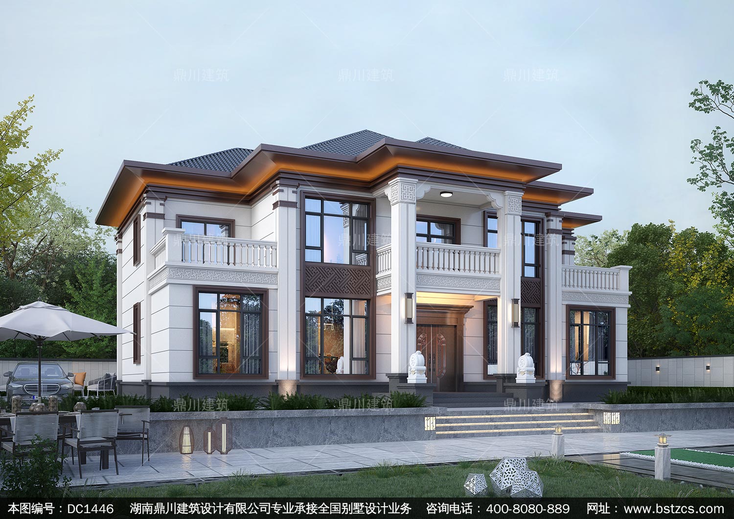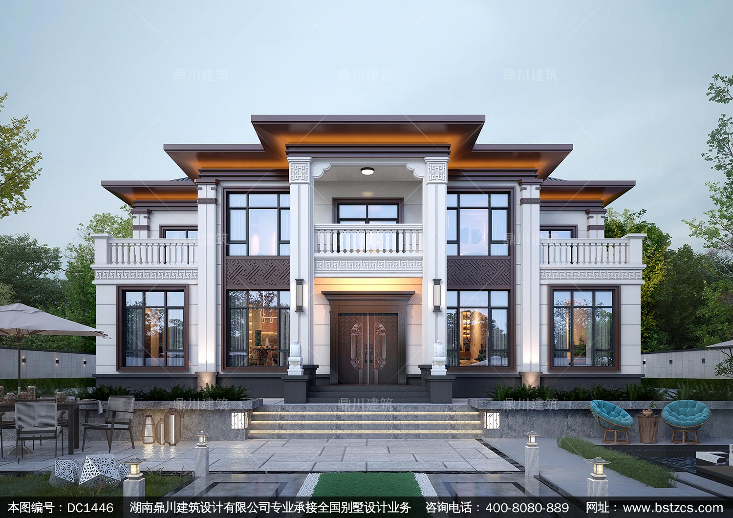 大气新中式二层别墅施工图纸及效果图_农村自建别墅设计,鼎川建