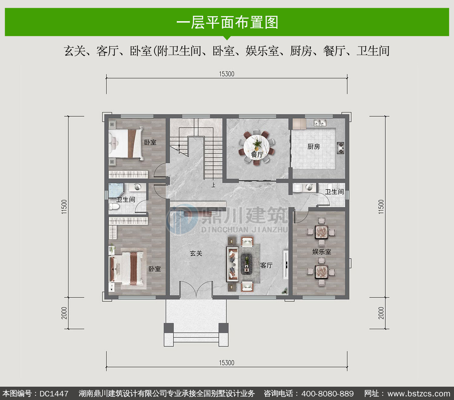 | 一 层: | 玄关、客厅、卧室(附卫生间、卧室、娱乐室、厨房、餐厅、卫生间 | |||