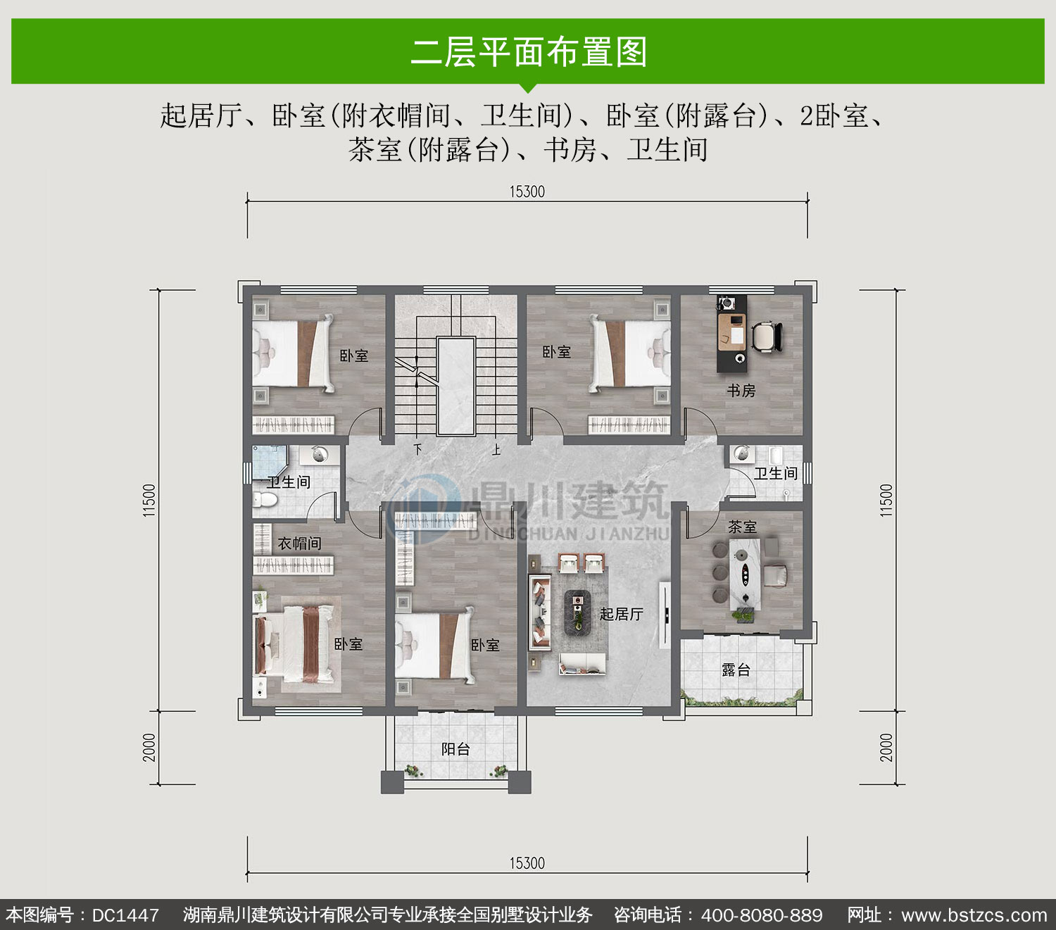 | 二 层: | 起居厅、卧室(附衣帽间、卫生间)、卧室(附露台)、2卧室、茶室(附露台)、书房、卫生间 | |||