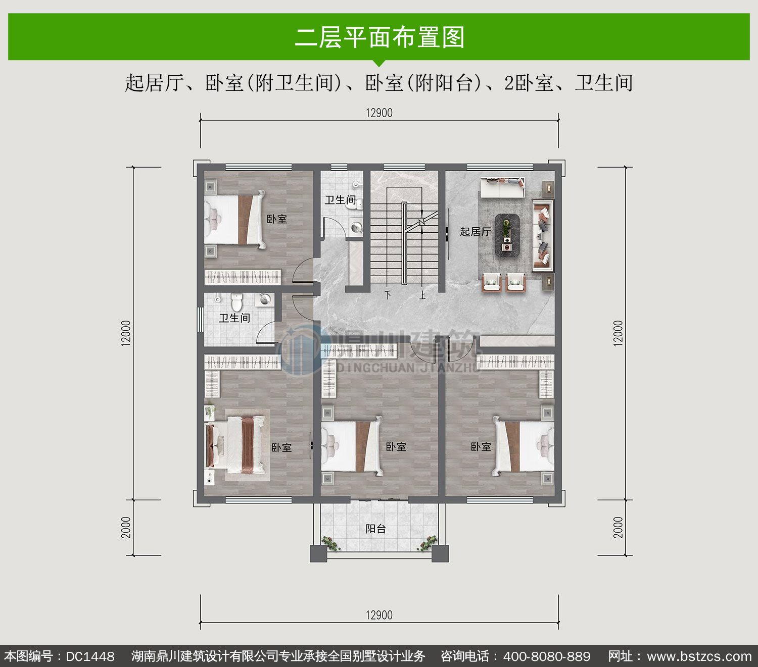 | 二 层: | 起居厅、卧室(附卫生间)、卧室(附阳台)、2卧室、卫生间 | |||
