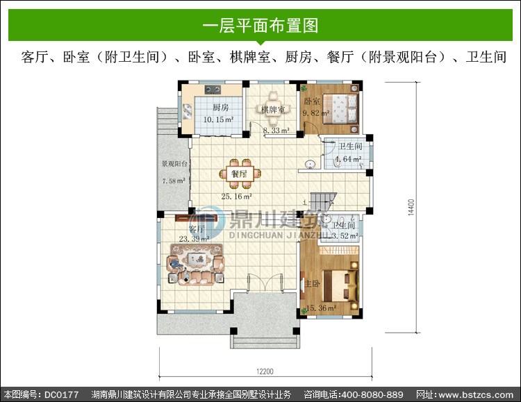 一 层: | 客厅、卧室(附卫生间)、卧室、棋牌室、厨房、餐厅(附景观阳台)、卫生间; | |||