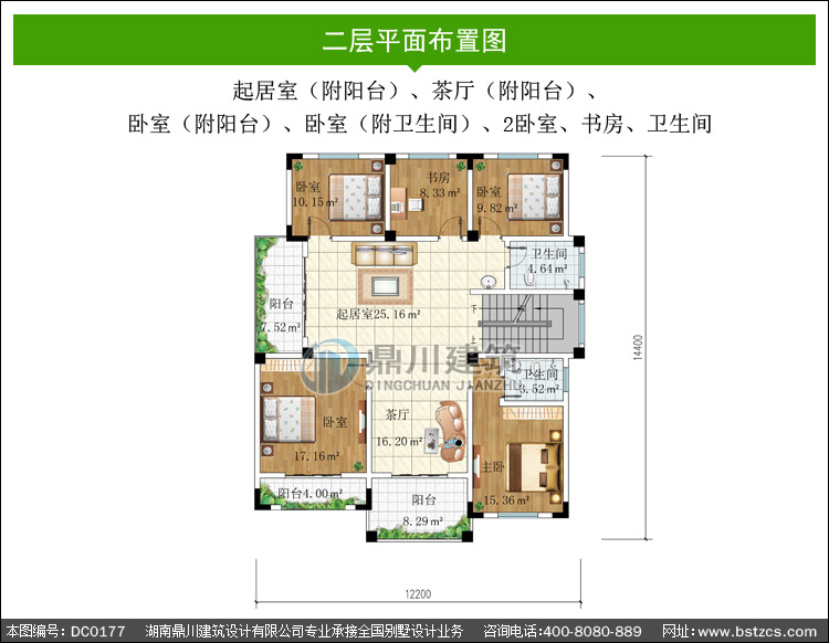 二 层: | 起居室(附阳台)、茶厅(附阳台)、卧室(附阳台)、卧室(附卫生间)、2卧室、书房、卫生间; | |||