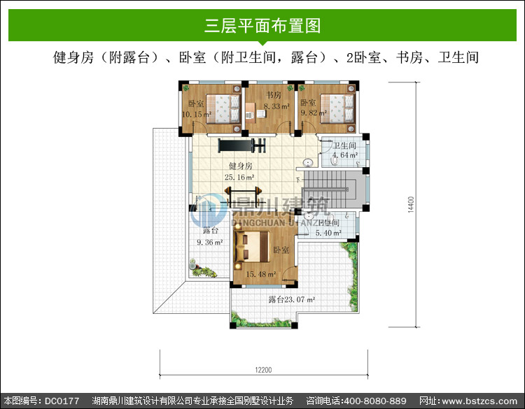 三 层: | 健身房(附露台)、卧室(附卫生间,露台)、2卧室、书房、卫生间 |