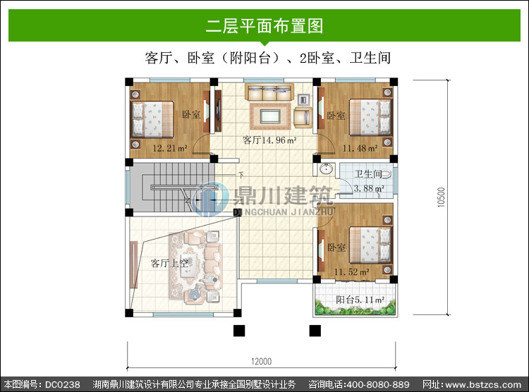 | 二 层: | 客厅、卧室(附阳台)、2卧室、卫生间 | |||