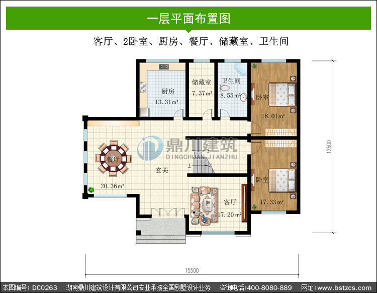 | 一 层: | 客厅、2卧室、厨房、餐厅、储藏室、卫生间 | |||