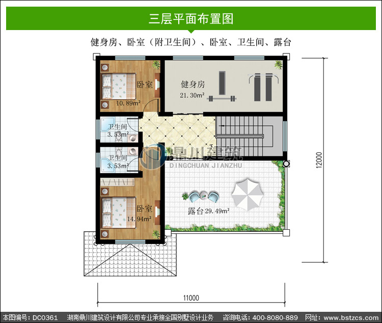 | 三 层: | 健身房、卧室(附卫生间)、卧室、卫生间、露台 | |||