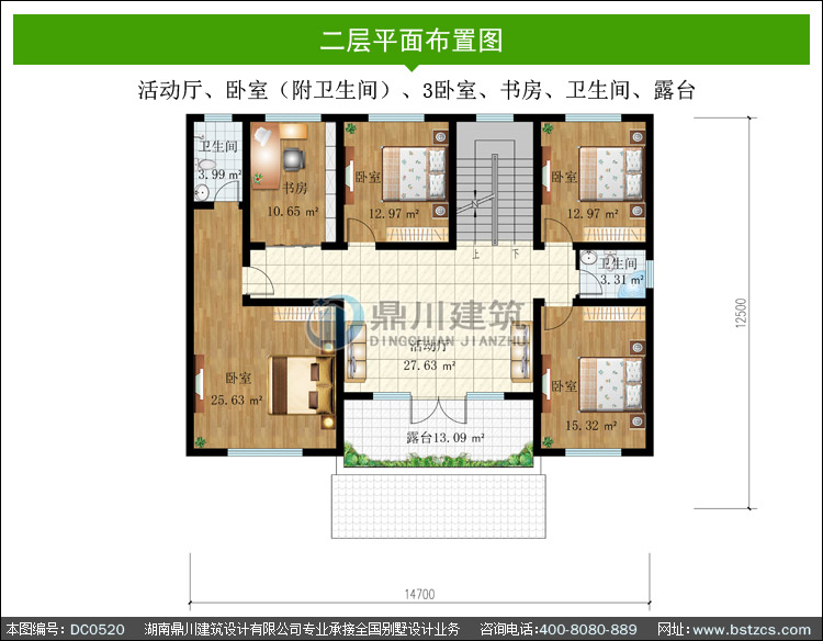 | 二 层: | 活动厅、卧室(附卫生间)、3卧室、书房、卫生间、露台 | |||