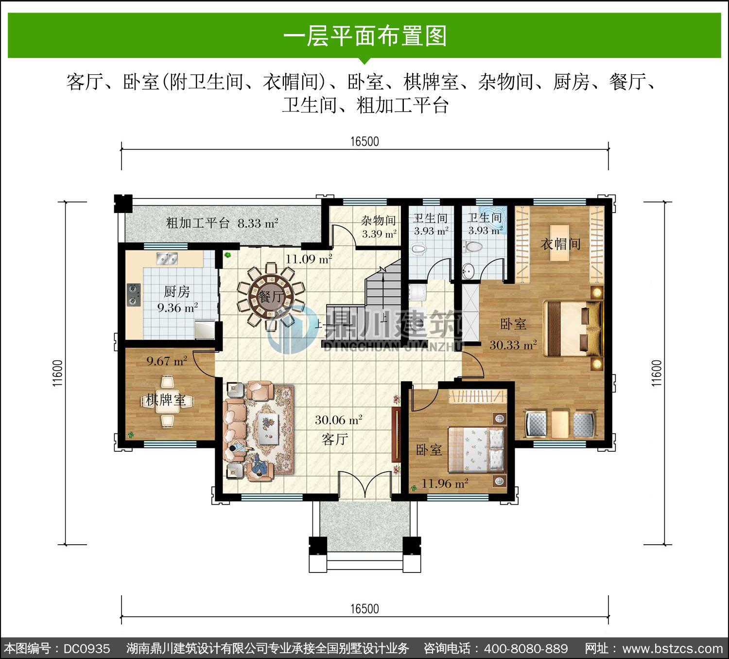 | 一 层: | 客厅、卧室(附卫生间、衣帽间)、卧室、棋牌室、杂物间、厨房、餐厅、卫生间、粗加工平台 | |||